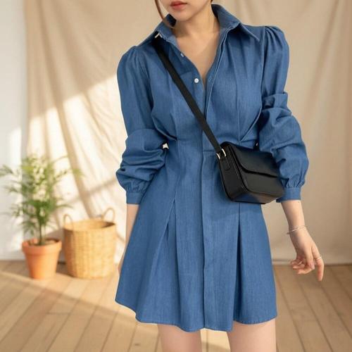 [옷자락]여성 핀턱 허리 볼륨 퍼프 소매 미니 원피스셔츠