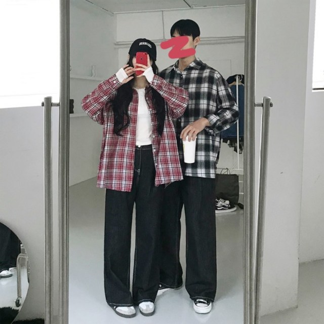 남녀공용 커플룩 오버핏 체크 남방 셔츠