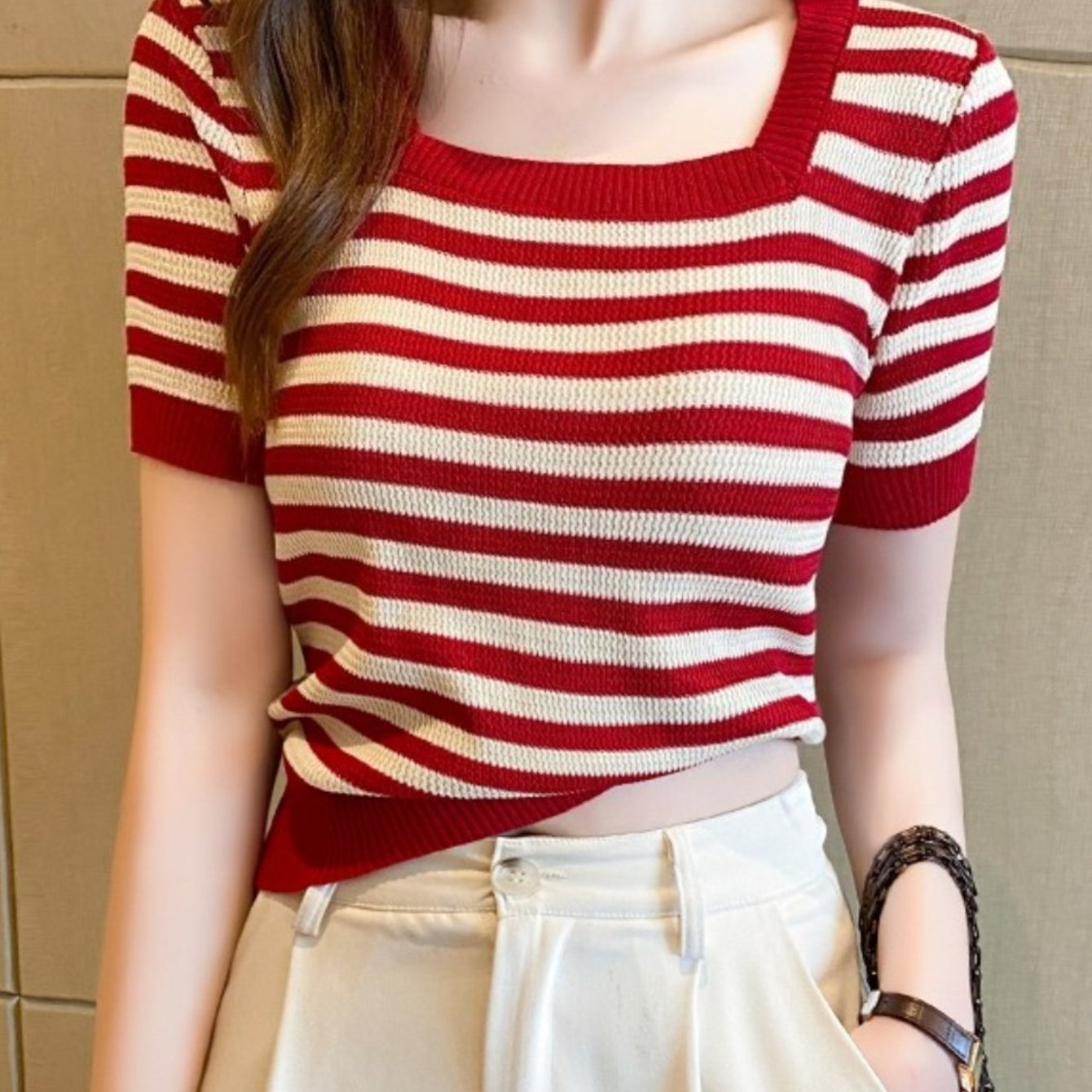 TEMU 여성용 신상 여름 스퀘어넥 반팔 티셔츠, 신상 여름 컬러 블록 아이스 파이버 원단 3/4 소매 탑, 슬림핏 크롭 탑, 티