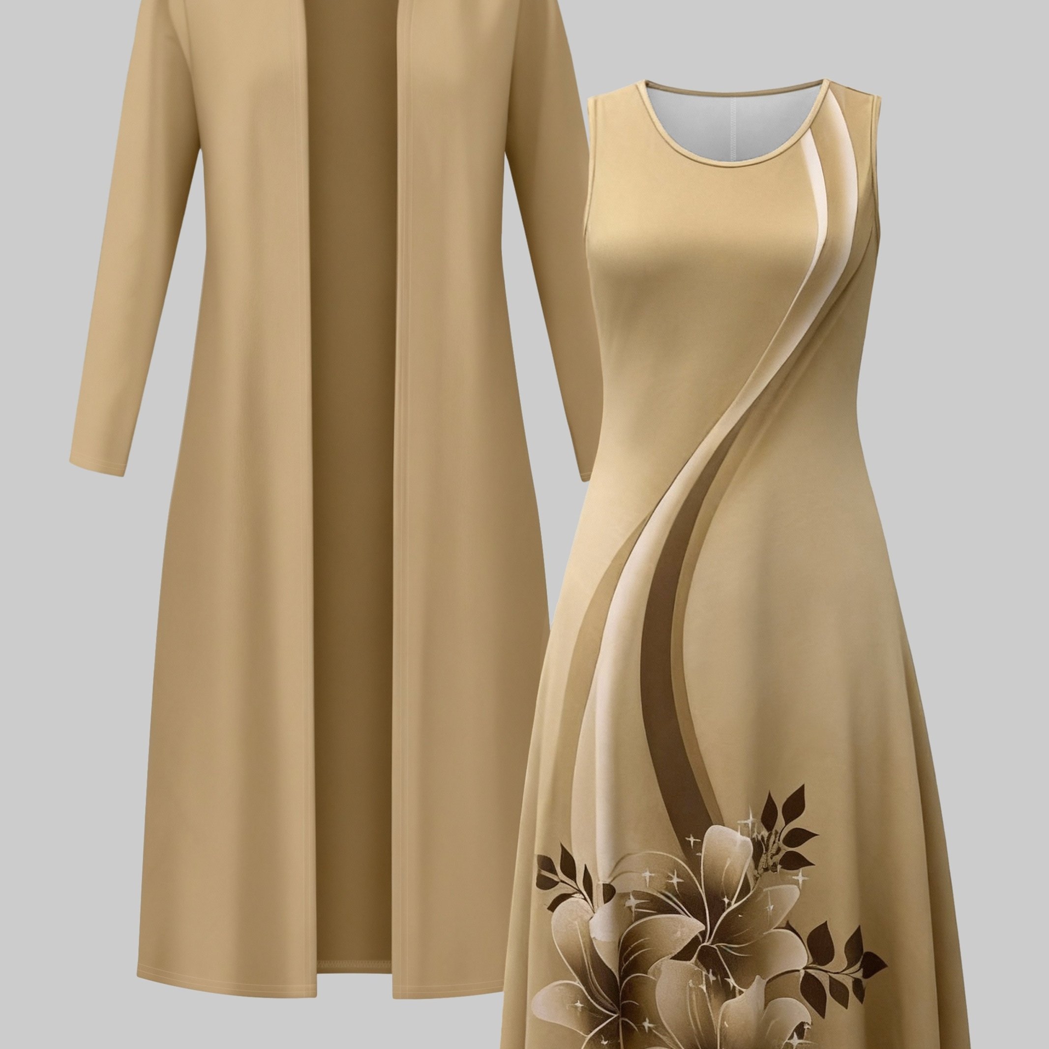 TEMU 여성용 프린트 웨이스트 드레스와 편안한 롱 가디건 2피스 세트, 세련되고 우아한 스커트 세트