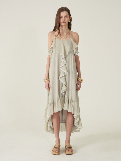 [까이에] 은사 스트라이프 면실크 센터 프릴 언밸런스 원피스