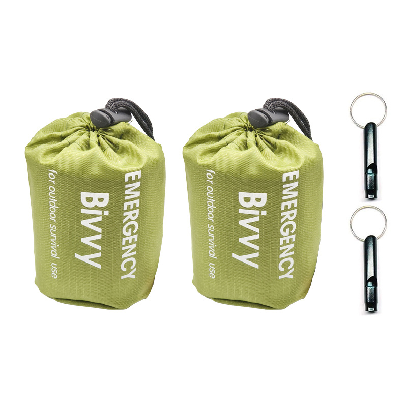 TEMU 비상용 침낭 + 보관 가방 + 호루라기 세트 2개, 경량 휴대용 비상 용품. 휴대용 비상용 침낭, 생존용 호루라기. 야외 캠핑, 하이킹, 지진 및 허리케인 같은 재난 후 보온용으로 적합. 남녀공용 및 사계절용