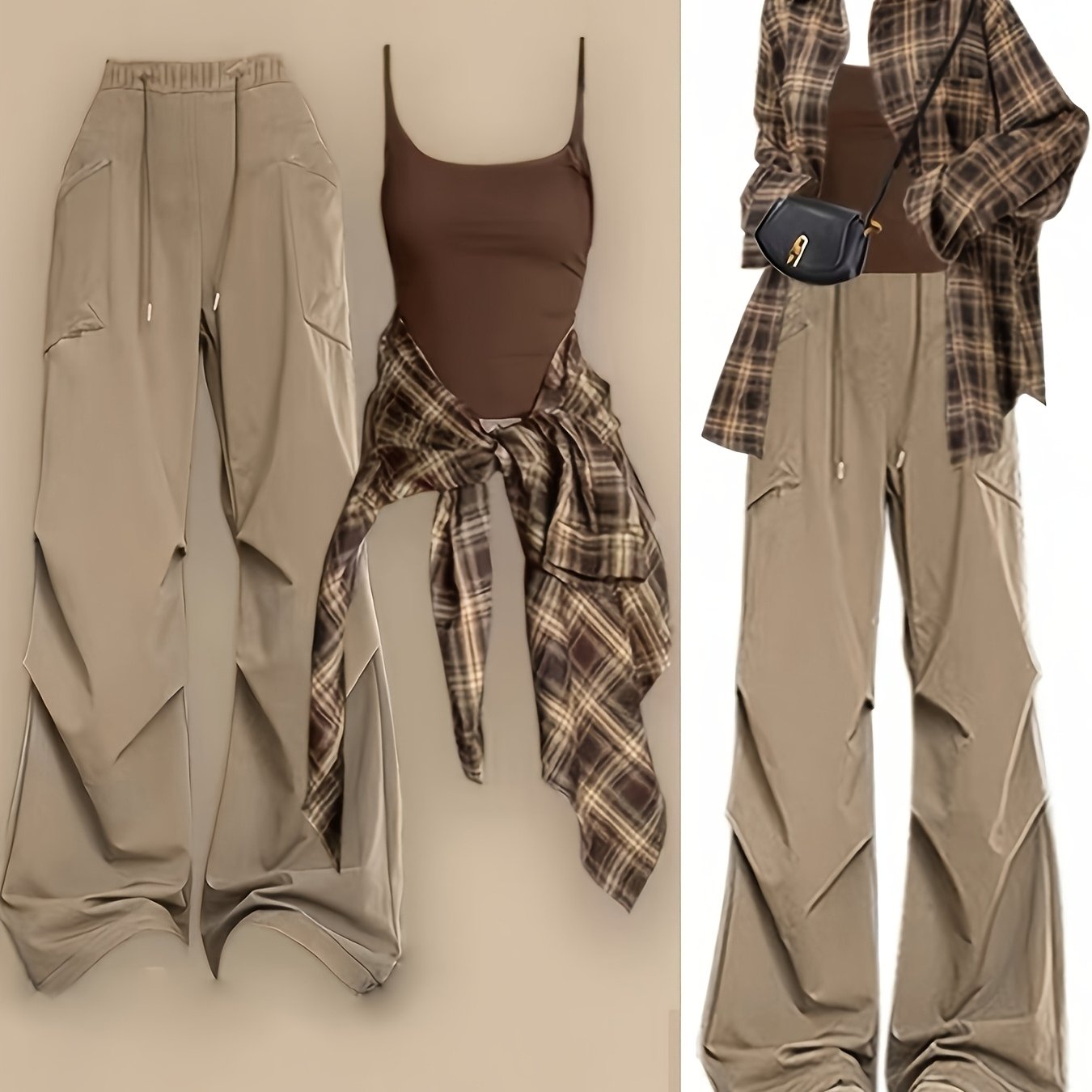 TEMU 여성용 Y2K 하라주쿠 스트리트웨어 3피스 세트 - 체크무늬 오버사이즈 루즈핏 매칭 세트 (하이웨이스트 와이드 레그 카고 팬츠, 드로스트링 & 매칭 조끼 포함) - 사계절 캐주얼 의상, 패션 의류