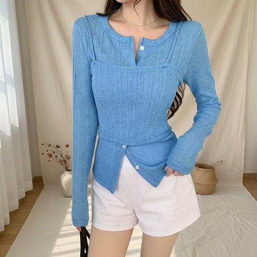 [옷은날개] 크롭 사선버튼 니트탑 니트 슬림라인 퍼프 포인트