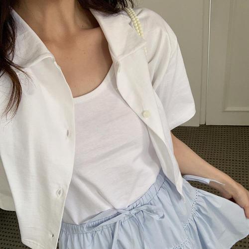 [옷자락] 여자 베이직 끈나시 카라넥 세미크롭 반팔 골지 가디건 세트