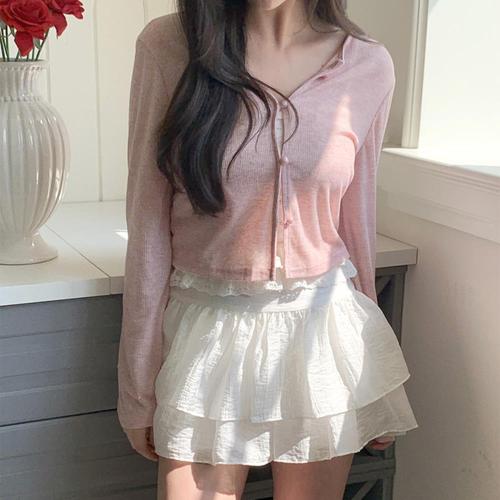 [옷자락]여자 폴리 잔꽃 콩단추 프릴 시스루 크롭 가디건 세트