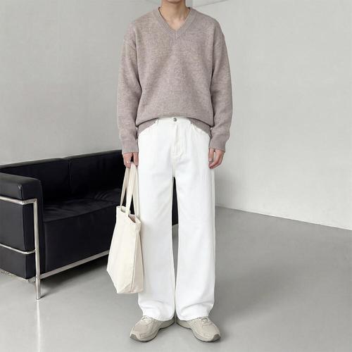 [노멀쉐이크]크롭 브이넥 니트 뒷밴딩 세미와이드 청바지 세트