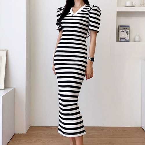 슈팅스타 / 브이넥 퍼프 스트라이프 니트 슬림 롱 원피스 516123