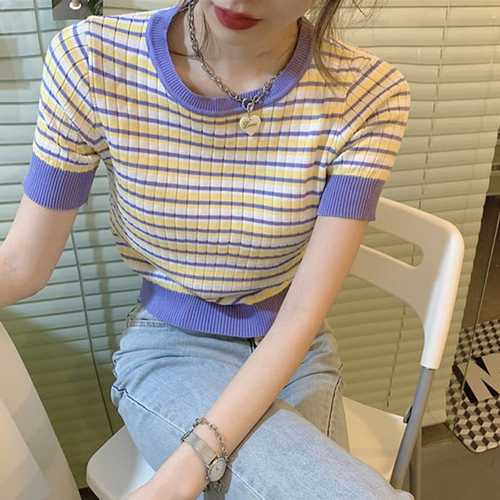 슈팅스타 / 타이트 슬림 스트라이프 배색 반팔 니트 티셔츠