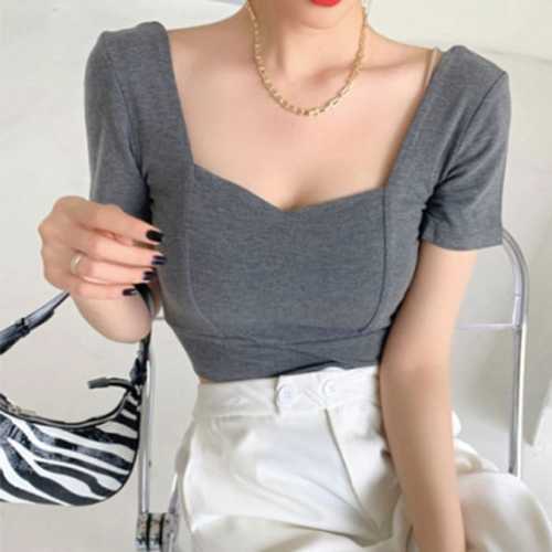 슈팅스타 / 딥스퀘어넥 타이트 슬림 크롭 숏 반팔티셔츠