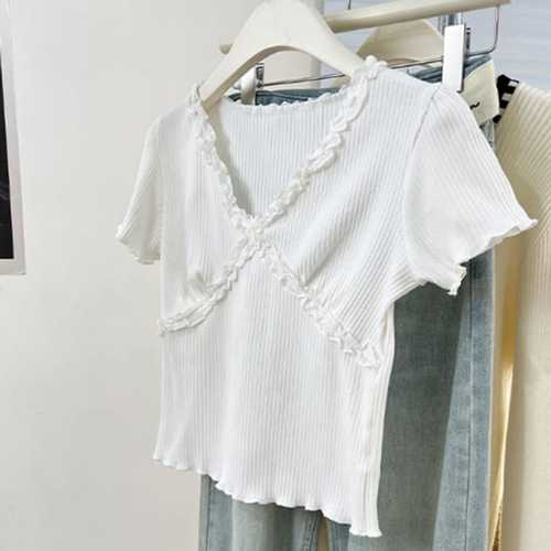 슈팅스타 / 브이넥 골지 프릴 타이트 슬림 반팔 티셔츠