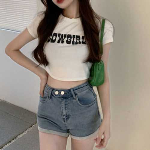 슈팅스타 / 트랜디 라운드넥 레터링 타이트 슬림 크롭 반팔티