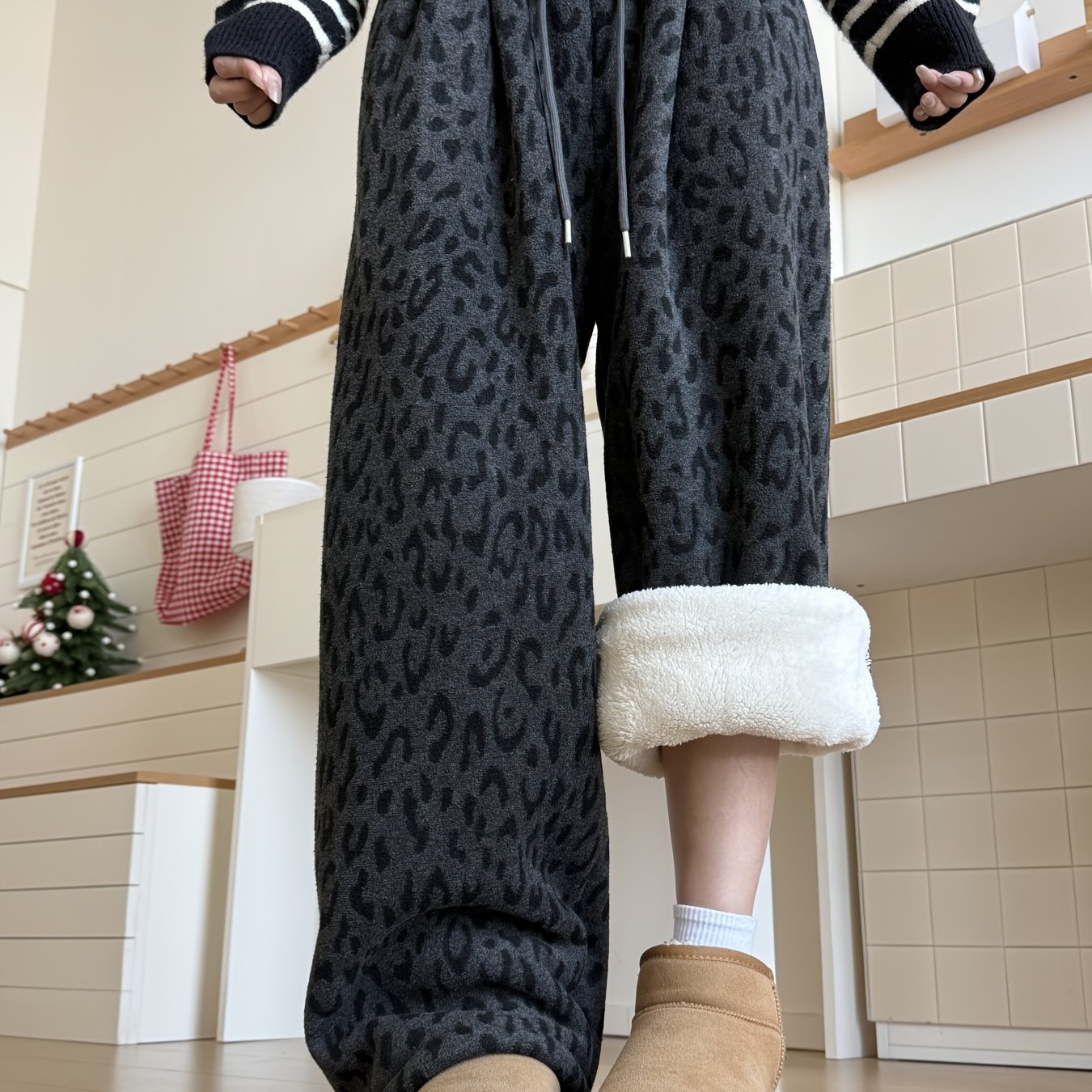 TEMU 여성용 겨울 와이드 레그 팬츠 - 두꺼운 프린트 하이웨이스트 트라우저, 루즈핏 풀 레그 길이, 캐주얼 아웃핏, 야외 및 캐주얼용 (필수 없음) | 가을/겨울 레이어링용 세탁기 사용 가능
