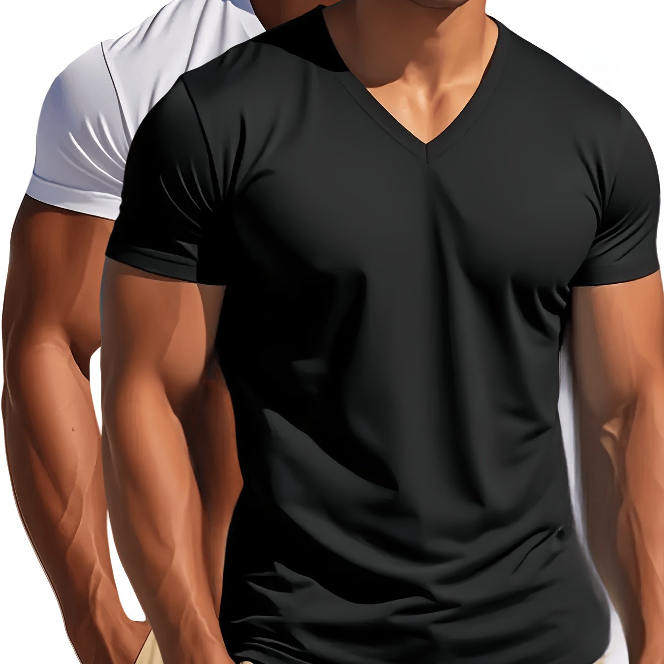TEMU 남성용 솔리드 컬러 V넥 반팔 티셔츠 2pcs 믹스 컬러 세트, 여름 필수 아이템, 빠른 건조 폴리에스터, 야외 러닝 및 운동에 이상적, 세탁기 사용 가능