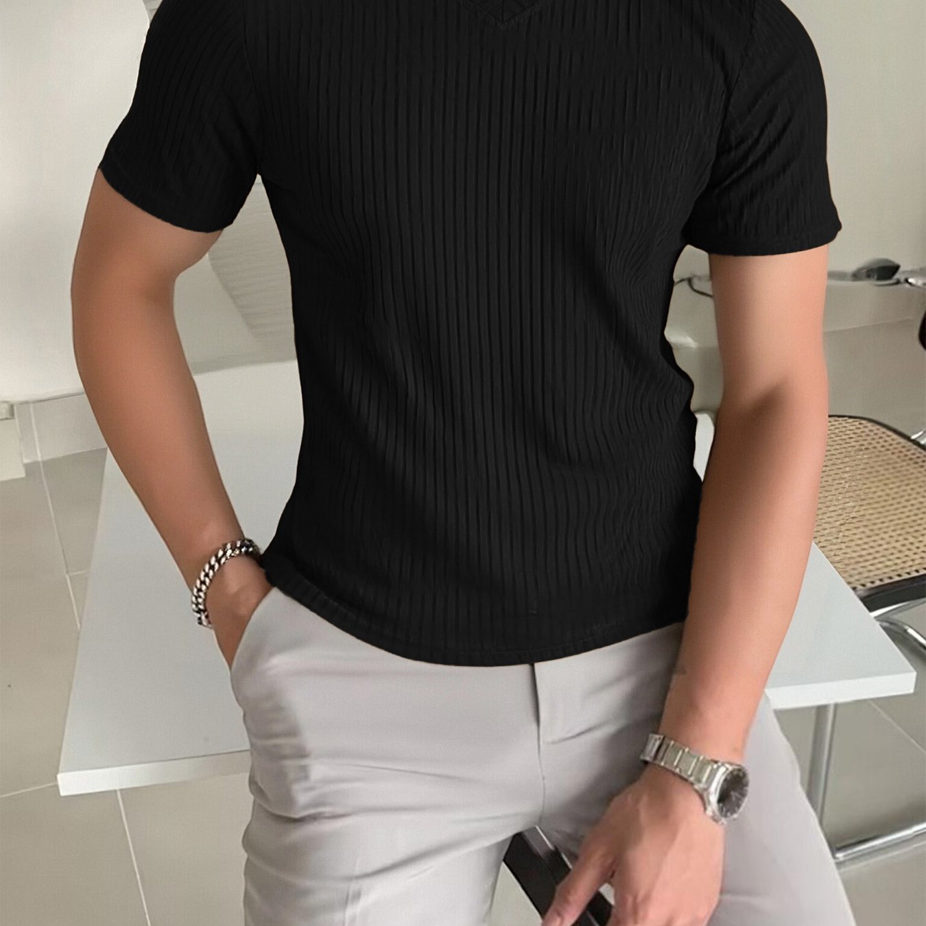 TEMU 남성용 패셔너블 캐주얼 세로 V넥 티셔츠 (여름)