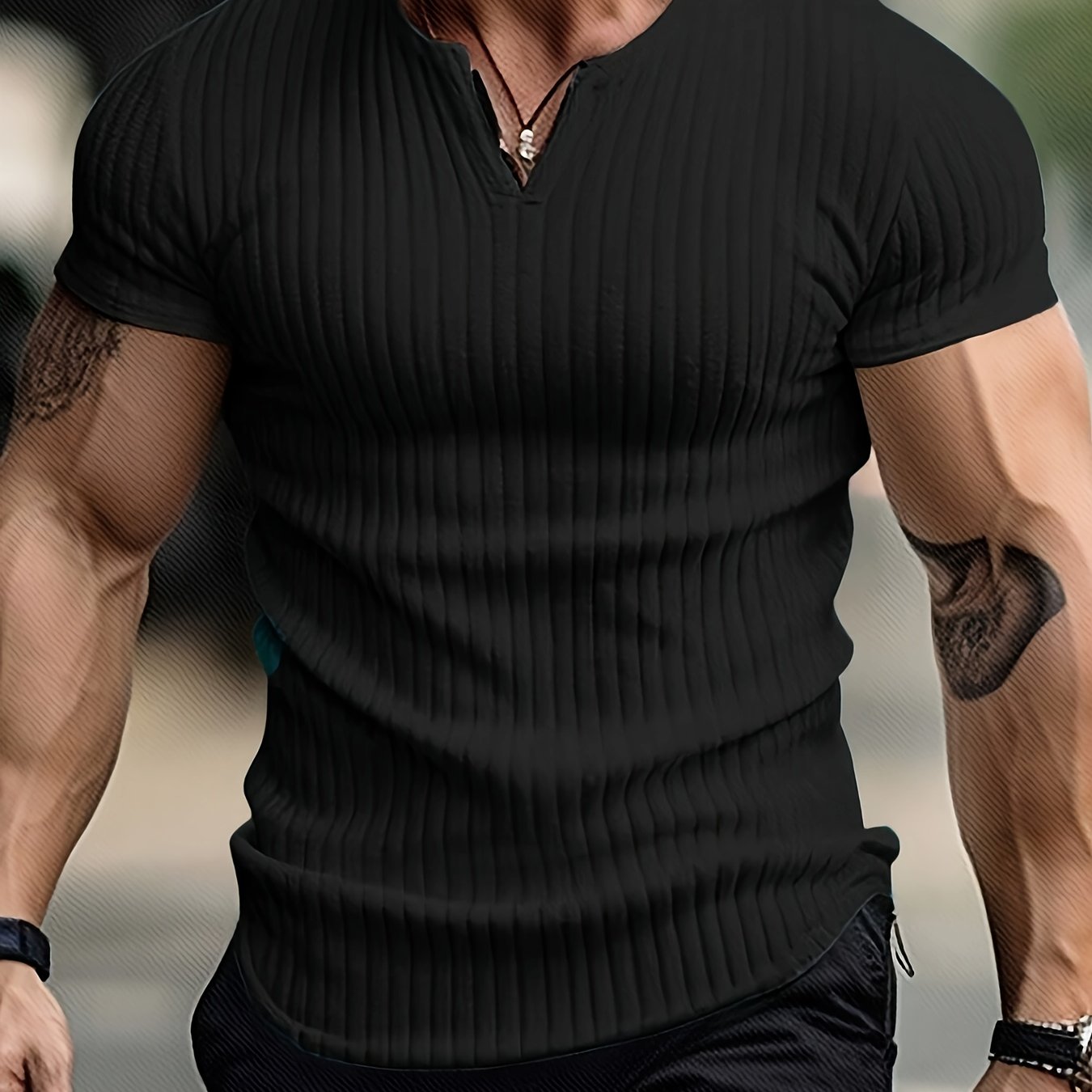 TEMU 남성 캐주얼 V넥 패션 반팔 티셔츠 헨리 - 핏 스타일, 곡선형 밑단 디자인, 야외 활동 및 일상적인 캐주얼 웨어에 적합