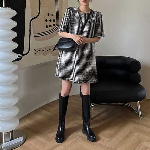슈팅스타 / 하운드투스 체크 태슬 심플 베이직 고급스러운 원피스