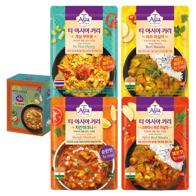 티아시아키친 비프 마살라 커리, 170g, 3개 + 치킨 마크니 커리, 170g, 3개 + 게살 푸팟 퐁커리, 170g, 3개 + 비프 키마 커리, 170g, 3개