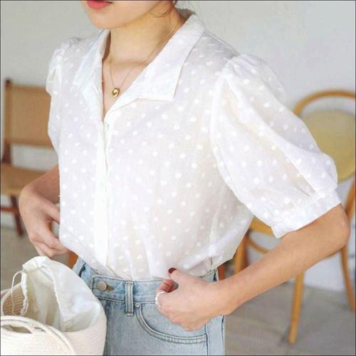 페미닌 퍼프소매 청순 여름 반팔 얇은 시스루 여자 블라우스 WFKBX3A
