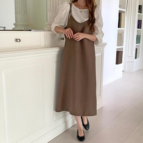 [옷자락] 여자 퍼프 블라우스 끈나시 롱 원피스 세트