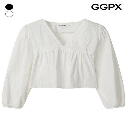 [GGPX]★단독특가★ V넥 레이스 셔링 숏 블라우스 (GQ3SH037F)