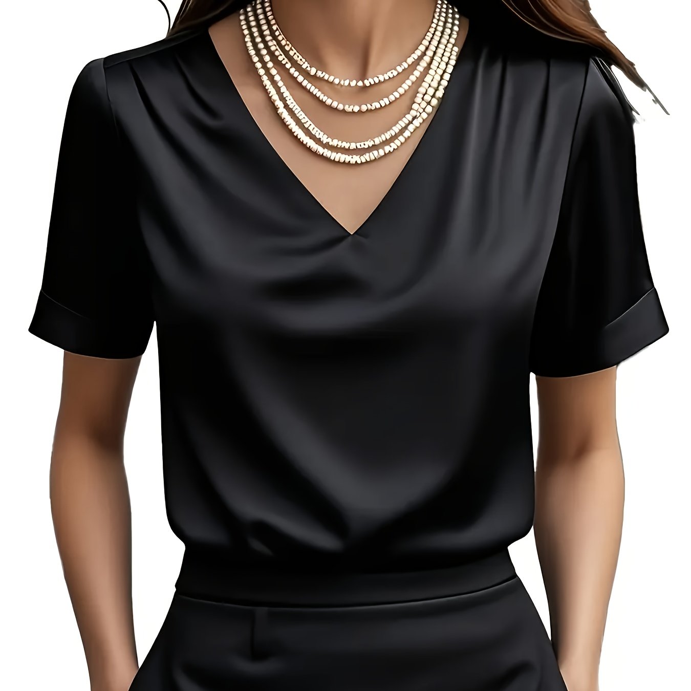 TEMU QD1017011 여성용 반팔 셔츠, 우아한 새틴 단색 드레이프 V넥 탑, 다양한 장면에 어울리는 우아한 스타일