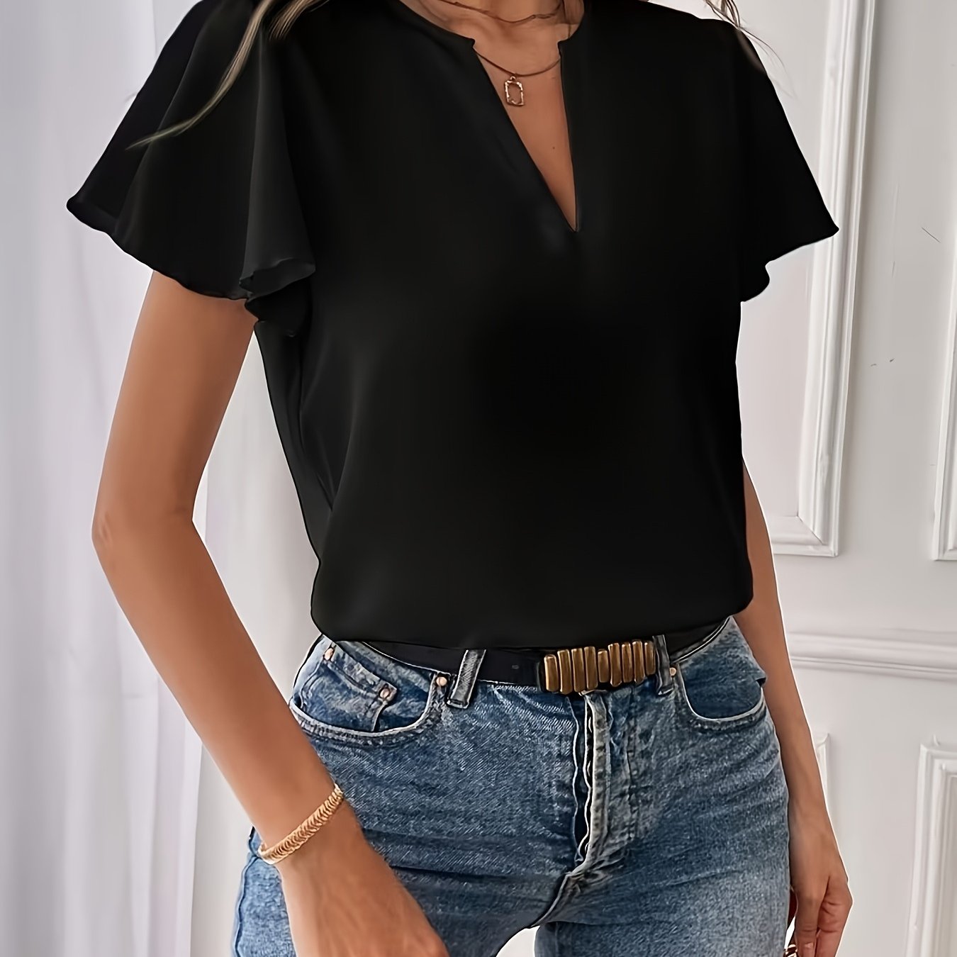 TEMU 여성용 엘레강스 브이넥 러플 소매 반팔 셔츠