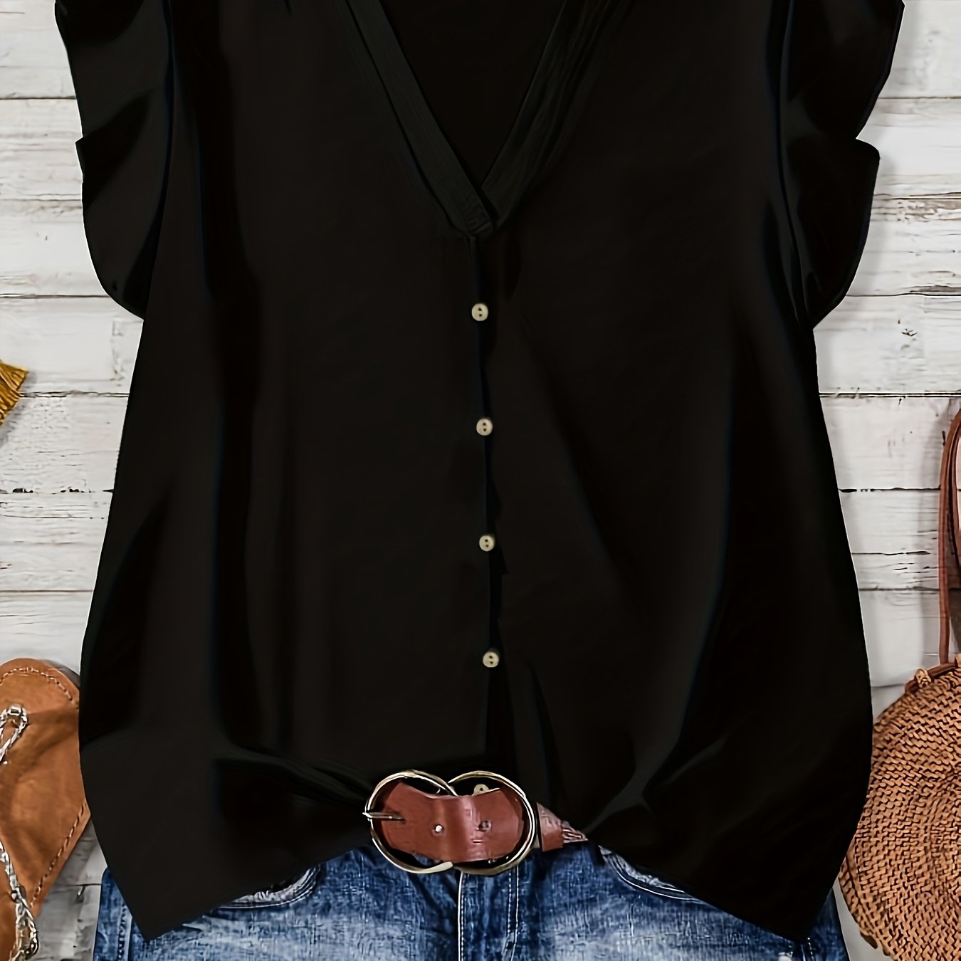 TEMU 우아한 여성용 단색 브이넥 버튼 장식 플러터 슬리브 셔츠