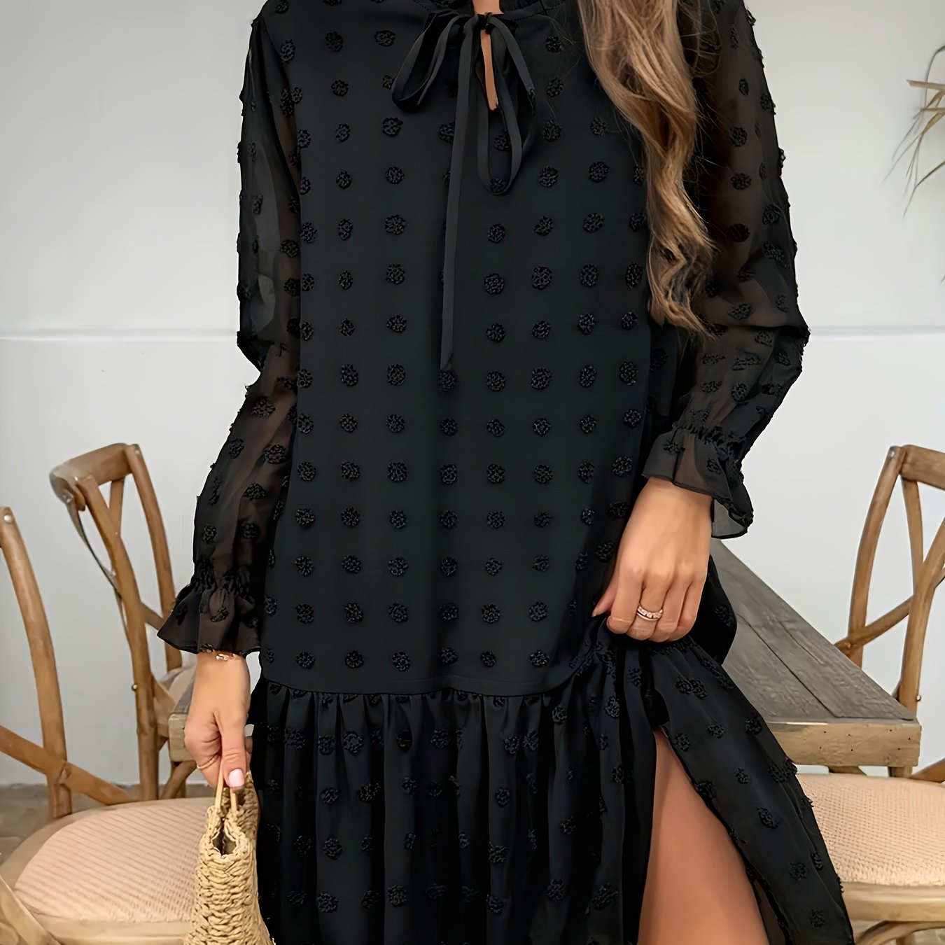 TEMU 우아한 여성용 자카드 폴카 도트 레이스업 브이넥 루즈핏 쉬폰 긴소매 리틀 블랙 드레스