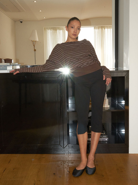 [프로보] 허리 셔링 목폴라 슬리브 티셔츠 / 블랙