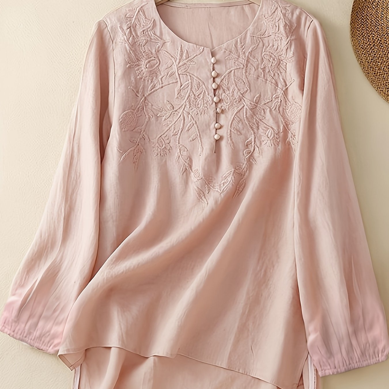 TEMU 가을 패션 여성 빈티지 자수 라운드넥 긴팔 루즈 캐주얼 셔츠 + YTD
