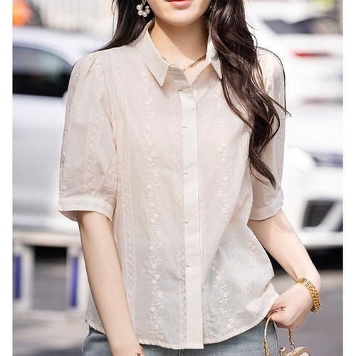 여름 브이넥 셔츠 블라우스 페미닌 펀칭 플라워 자수 WFKBXA1
