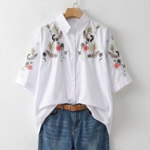 여성 100%코튼 플라워 반팔 셔츠 루즈핏 여름용 카라넥 반팔 블라우스 기본