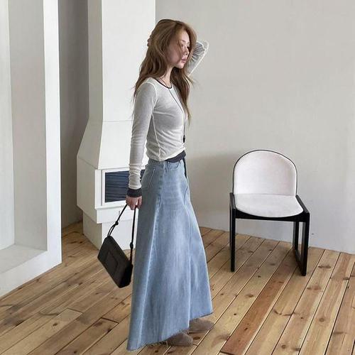 [옷자락] 여자 연청 하이웨스트 플레어 맥시 데님 스커트