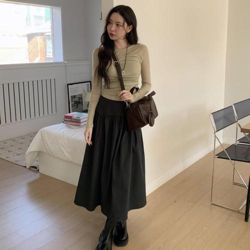[옷자락]여성 사계절 하이웨이스트 트임 슬림 롱스커트