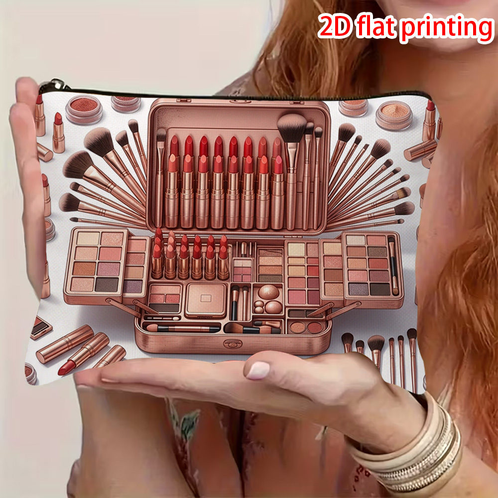 TEMU 메이크업 가방 1개, 2D 평면 프린팅, 로즈 골드 화장품 패턴이 있는 화이트 색상, 지퍼형 직사각형 파우치, 휴대용 및 경량, 여행용, 일상용, 여성 및 소녀를 위한 휴일 선물, 2D 평면