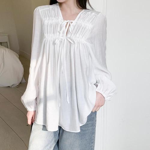 [신상오픈런]여성용 기본 브이넥 루즈핏 셔링 블라우스 데일리용
