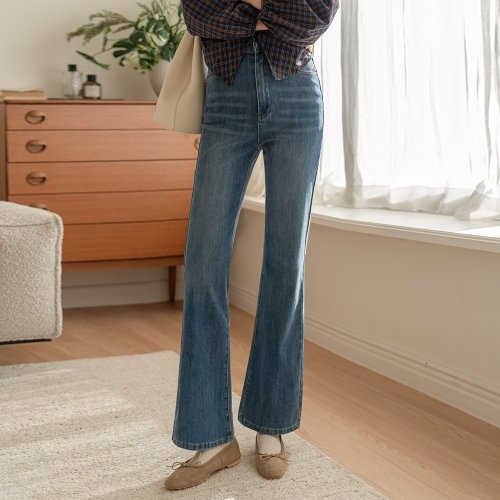 따뜻한 플리스 안감 빈티지 블루 진 여성 겨울 하이웨이스트 슬림핏 부츠컷 팬츠 심플한 가을 따뜻하고 편안한 데님