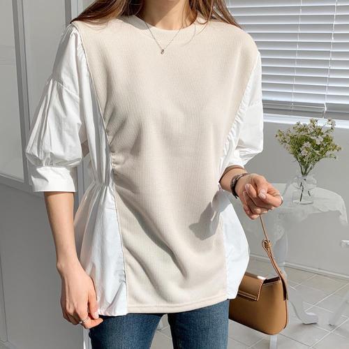 [옷자락] 여자 라운드넥 미들니트 배색 허리셔링 블라우스