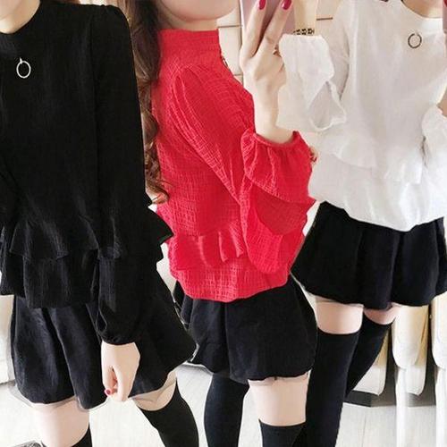 Makone 여성 카라넥 긴팔 블라우스 앞단 프릴 패츠 포인트 캐주얼 셔츠