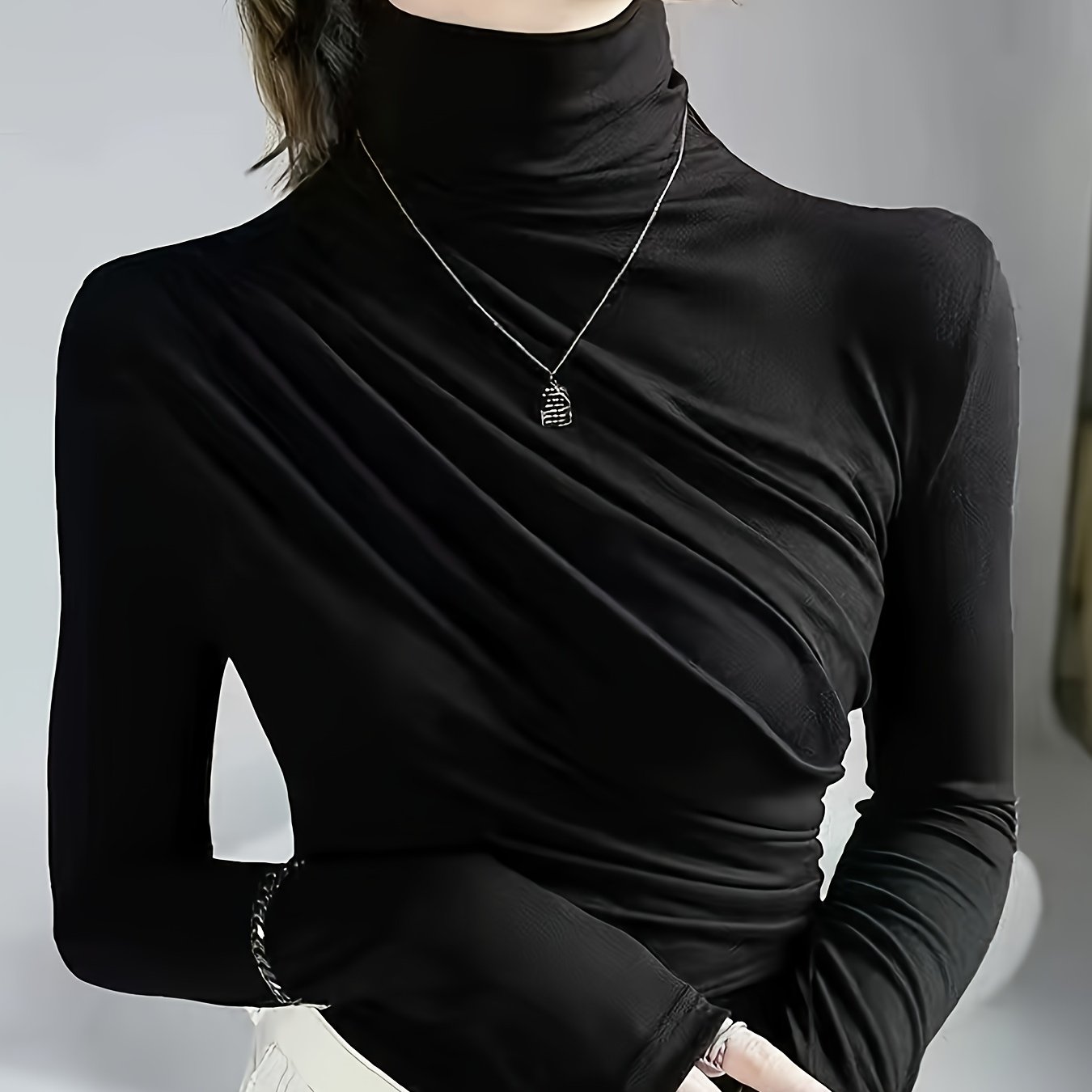 TEMU 여성 가을/겨울 긴팔 터틀넥 단색 핏 티셔츠, 앞면 및 허리 플리츠 디테일