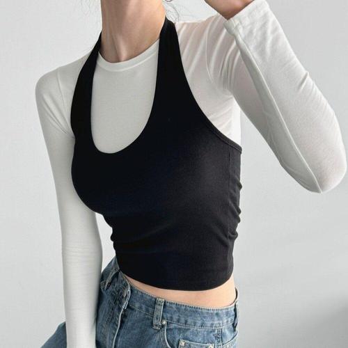 [미라클세븐]여성 슬림핏 유넥 홀터넥 크롭 나시 백리스 스판 탑