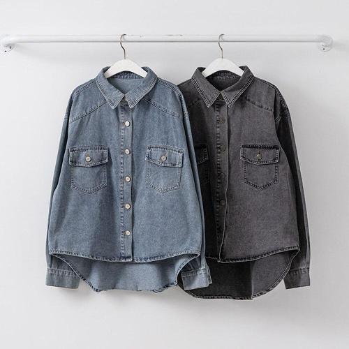 [옷자락]여성 언발란스 루즈핏 힙커버 포켓 데님셔츠 면 봄 블라우스