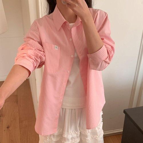 [옷자락]여성 벚꽃 스타일 분홍 루즈핏 힙커버 스트라이프 블라우스