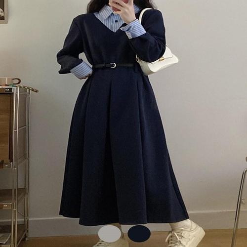 정장원피스 여성 겨울 라운드넥 언발 니트 롱 스커트 벨트 투피스