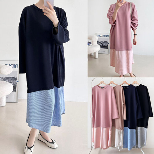 [유야]여성 밑단 배색 라운드 긴팔 롱 원피스 -FOP0395- 봄 가을