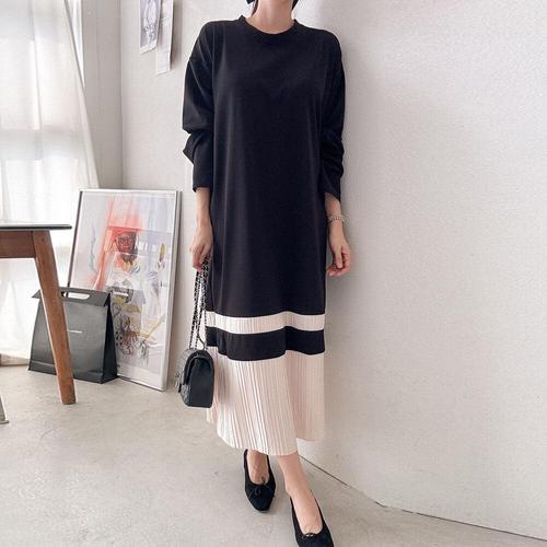 [문에이블]문에이블 여성스러운 배색 밑단 플리츠 편안한 루즈핏 가을 롱 원피스