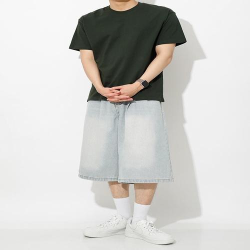 [디바옴므]스트릿 와이드 카고 버뮤다 바이오 워싱 데님 6부 밴딩 팬츠 반바지 청바지