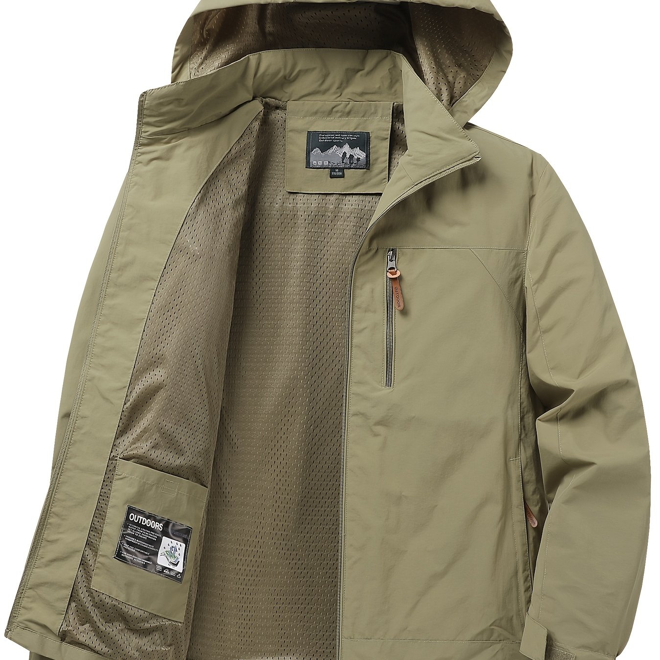 TEMU 세련된 Volvik 프린트 디자인, 풀 지퍼 클로저, 지퍼 포켓이 특징인 남성용 경량 사계절 후드 재킷 - 캐주얼 및 사무실에 적합한 폴리에스터 소재의 스포티한 방풍 재킷