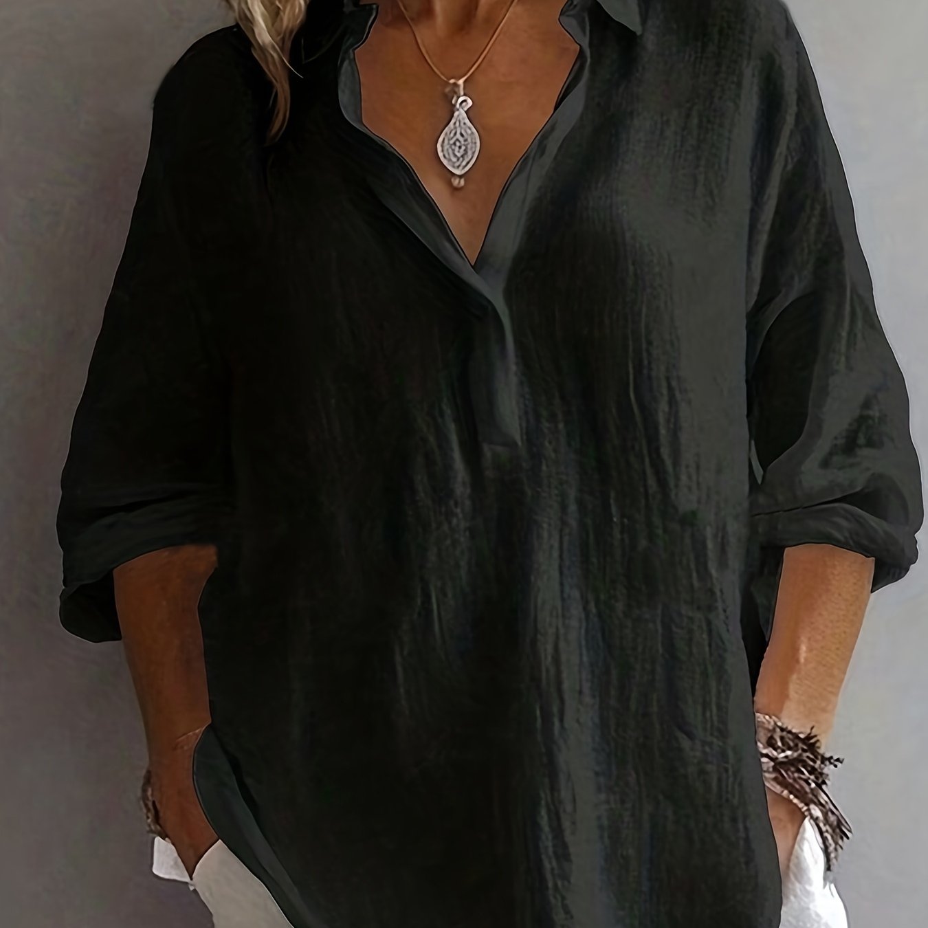 TEMU 플러스 사이즈 - 플러스 사이즈 - 플러스 사이즈 여성용 세미 오픈 칼라의 세련되고 우아한 긴팔 셔츠 (신상)